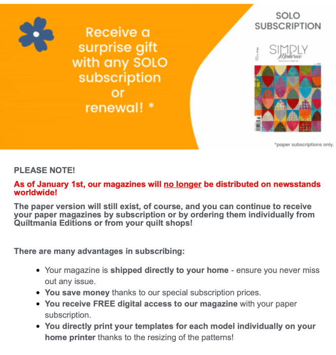 And now, a personal note. Above is a screenshot from QuiltMania Magazines, which publish three different journals: Simply Vintage, Simply Moderne, and QuiltMania. If you haven’t looked into subscribing to a magazine, one of these can be recommended, depending on your interest. This publication is one of the jewels of our quilting industry, which for some, have taken the place of our beloved — but now gone — Quilters Newsletter. One of their features is publishing photos of quilts in quilt shows from around the world. We nearly lost this publication at the beginning of covid: I did a feature with them that people were able to get free patterns by subscribing to their newsletter (all the patterns have now come back home to my website). So this news –about not being available on newsstands — alarmed me, and thought it was a good time to give them a plug. As quilters, if we don’t support our industry or publications, they won’t be here when we want them. If you can subscribe, or are interested, here is the link.