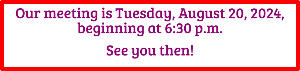It will be this Tuesday, August 20, 2024. Because we need all the space, please don’t bring anything for the freebie counter. The doors open at 5:30, with the meeting beginning at 6:30 p.m. See you then!!