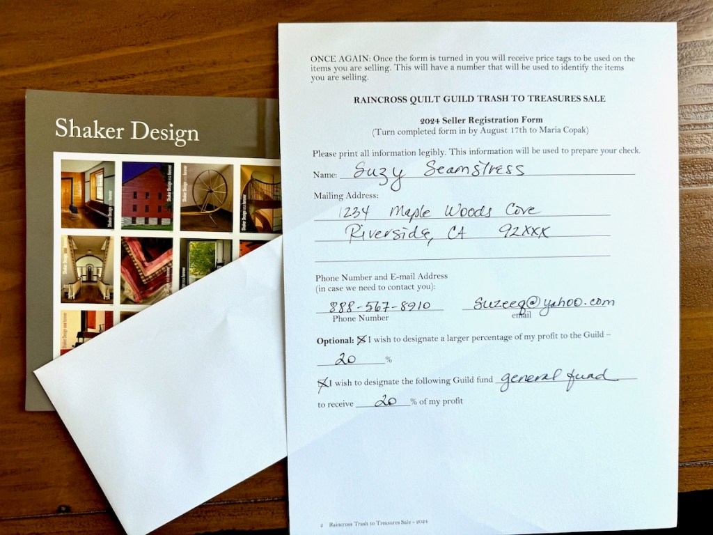 Filling out the form, find an envelope and a pretty stamp took 4 minutes. You have four minutes today, right? Then you can start digging for things to sell all this weekend. Suzy Seamstress designated 20% to the guild, but that is optional. After the sale, the guild will deduct what you so generously share, and send you a check for the remainder. All the info is on this next download: