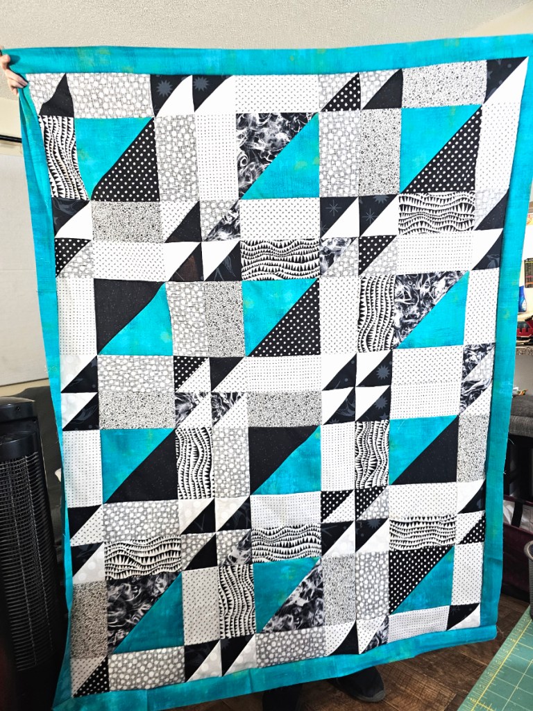 Jennifer made a sample of our Challenge quilt for this fall, and brought it to meeting to show. You can see that she used all one fabric for the accent color, but lots of different black/white prints for the rest of the quilt.