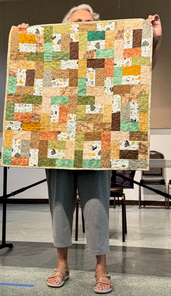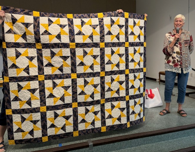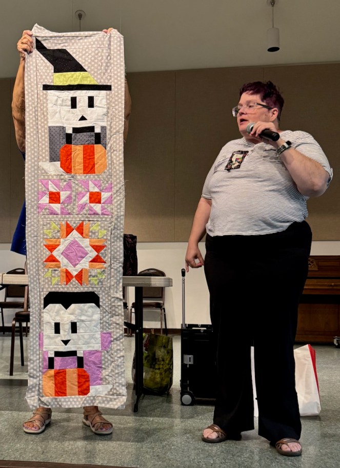 Below is a Gallery of all the quilts at our Meeting this week. You are all so busy and productive, and so many interesting works to share. Thank you for bringing them, and thank you to all who smiled for the camera. 🙂