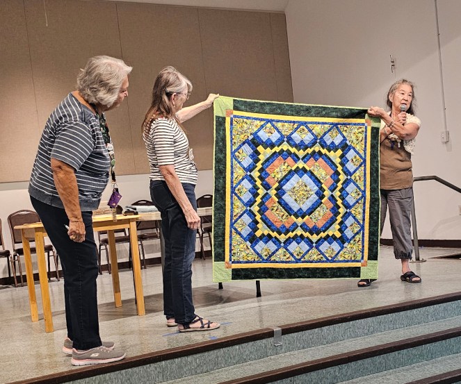 Those who brought quilts and quilty projects were: Barbara Mathews, Lorraine Halvorson, Chris Kearns, Jennifer Hayford, Florence Patrick, Fern Fujimoto, and Joan Moreno. Thank you all!!