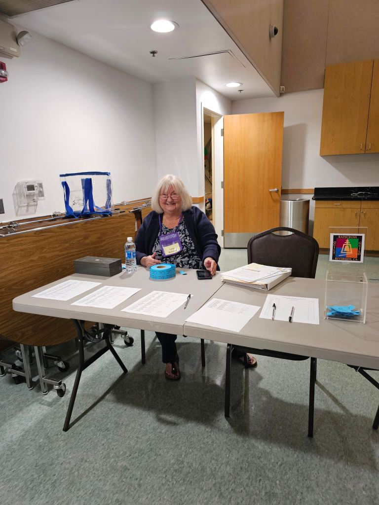 Linda McKenna mans the Membership Table, where we sign in for attendance, get our Door Prizes tickets.
