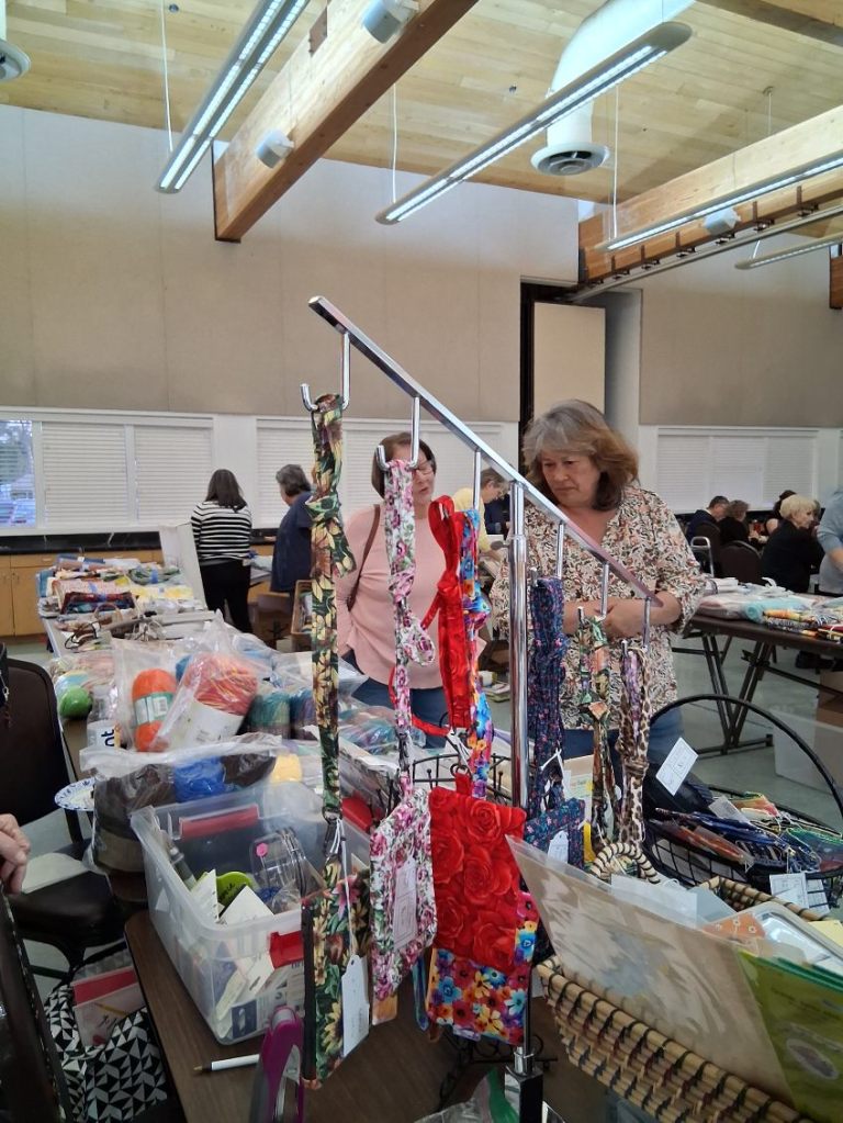 One man’s trash is another man’s treasure — so the saying goes. The Raincross Quilt Guild gathered up all of our excess supplies and displayed them for purchase. While some of us shopped, some of worked on hand sewing a Quilted Heart, and munching on goodies from the potluck desert social. A productive time was had by all.
