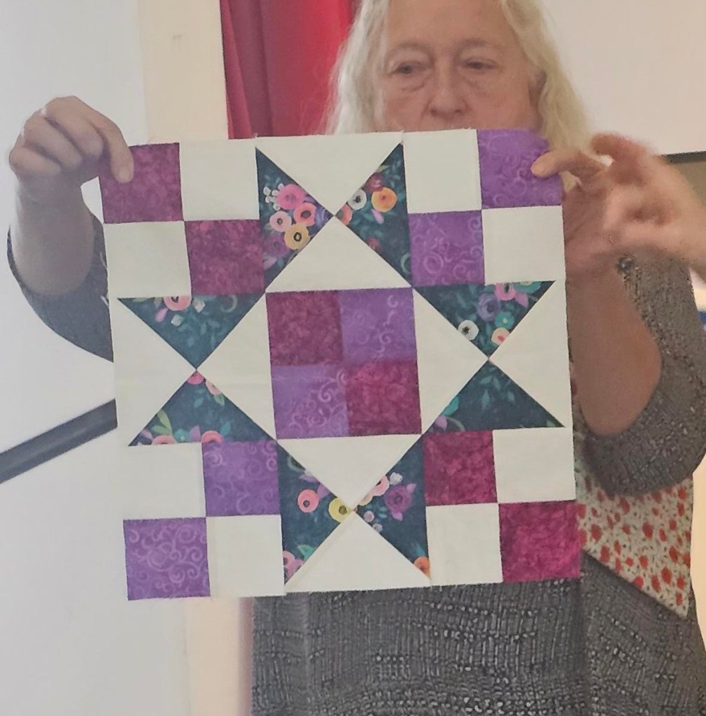 Welcome to this year’s BOM. We start today and will share finished quilts in December. Blocks will be of different sizes – that’s unusual but correct. First you will need to collect fabrics. Start with 2 yards of background – we are using a white on white. Next choose a print for a focus fabric (1 yd). We looked for one with two dominant colors. Finally collect scraps/fat quarters that coordinate with each of your dominant colors. That being said you may choose to make your blocks scrappy. Finished size of quilt before borders 42” x 54”.